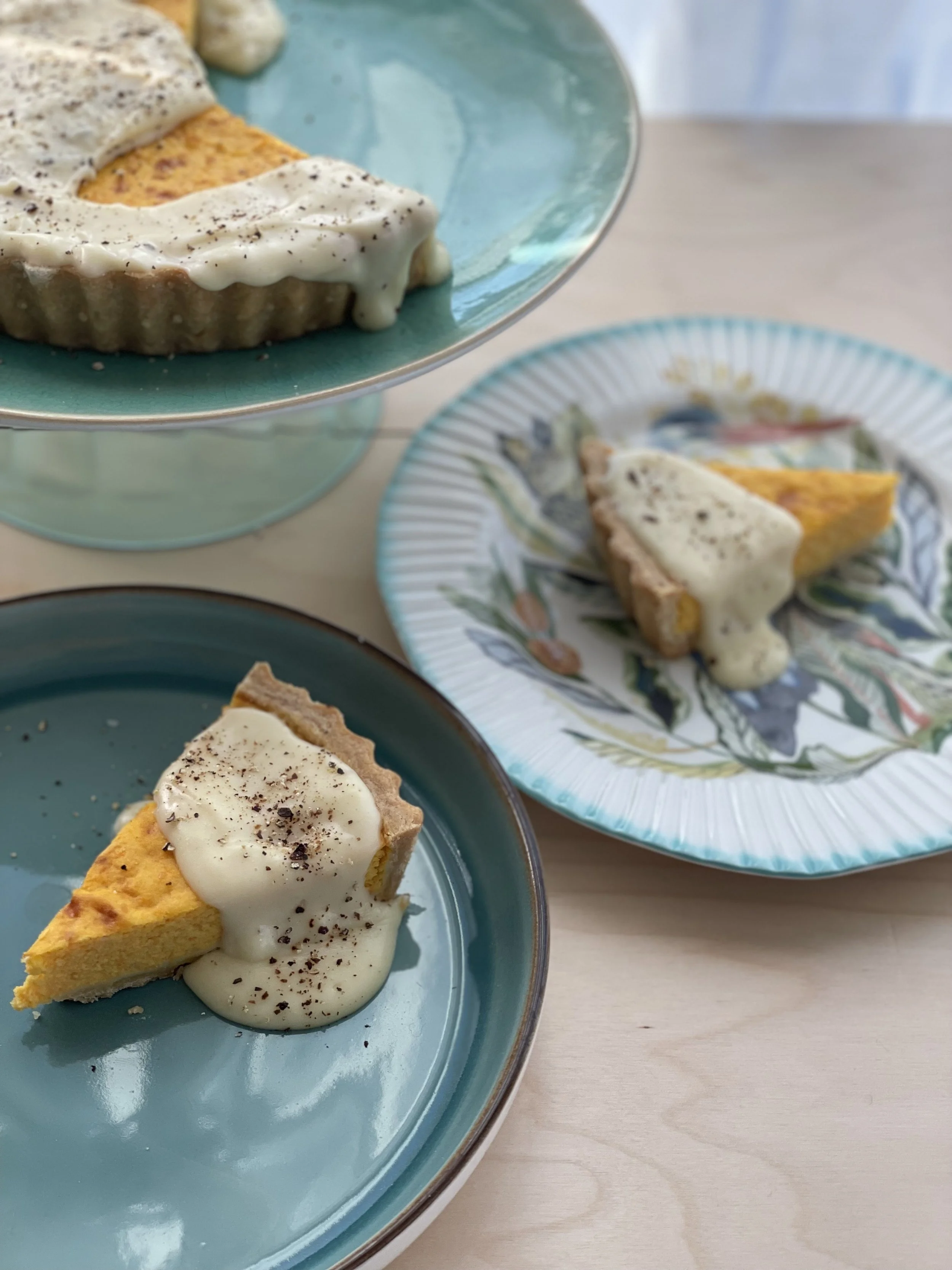 If you are baking the the tart straight with the filling, add a couple of tablespoons of cornflour between the base and the filling. The cornflour will absorb any excess liquid, leaving the bottom of your tart crunchy. This particular quiche can be baked directly with the filling. You only need to increase the overall baking time from 40 minutes to roughly 1 hour.