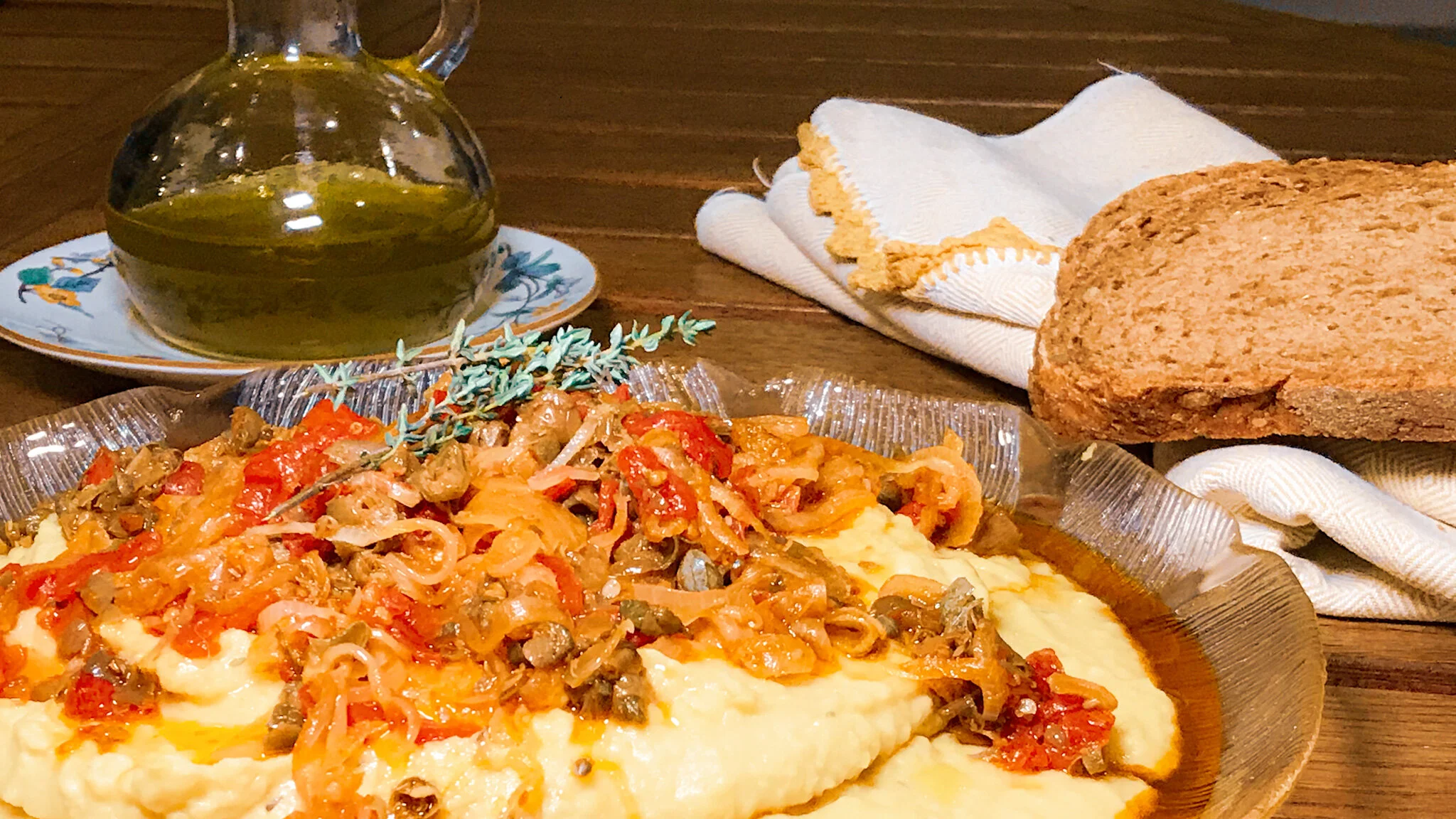 This version of fava is called married (Pantremeni) as it is paired with sautéed onions, capers and cherry tomatoes. These ingredients work so well together and complement each other…just like a perfect marriage.