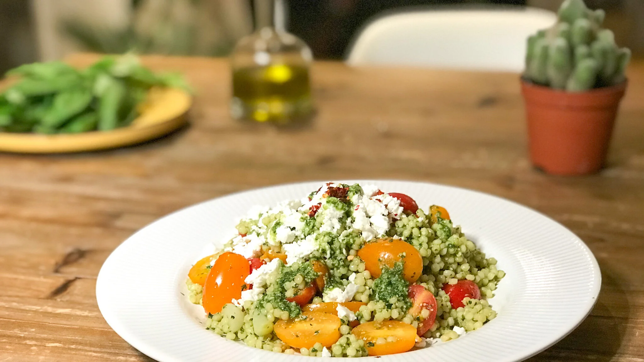 The combination of pesto and couscous is the base but what comes with it can change according to your taste. For example you could use sun-dried tomatoes and mozzarella instead of fresh tomatoes and feta.