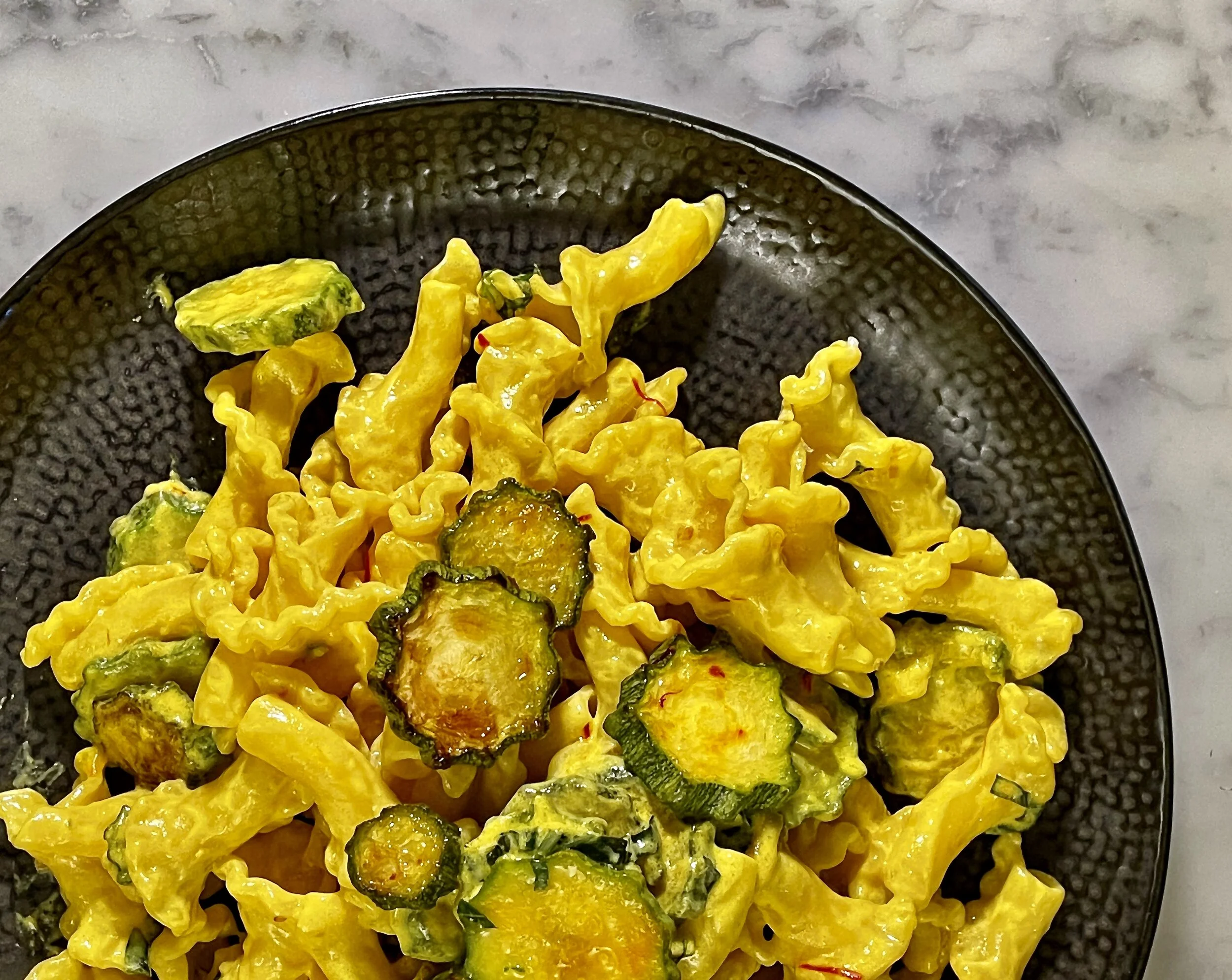 This is an old school recipe that contains a small amount of cream that helps all the ingredients come together in this fresh and tasty dish. The saffron gives you a very distinct taste that goes incredibly well with the sweetness of courgettes. The basil is the finishing touch that gives you extra freshness.