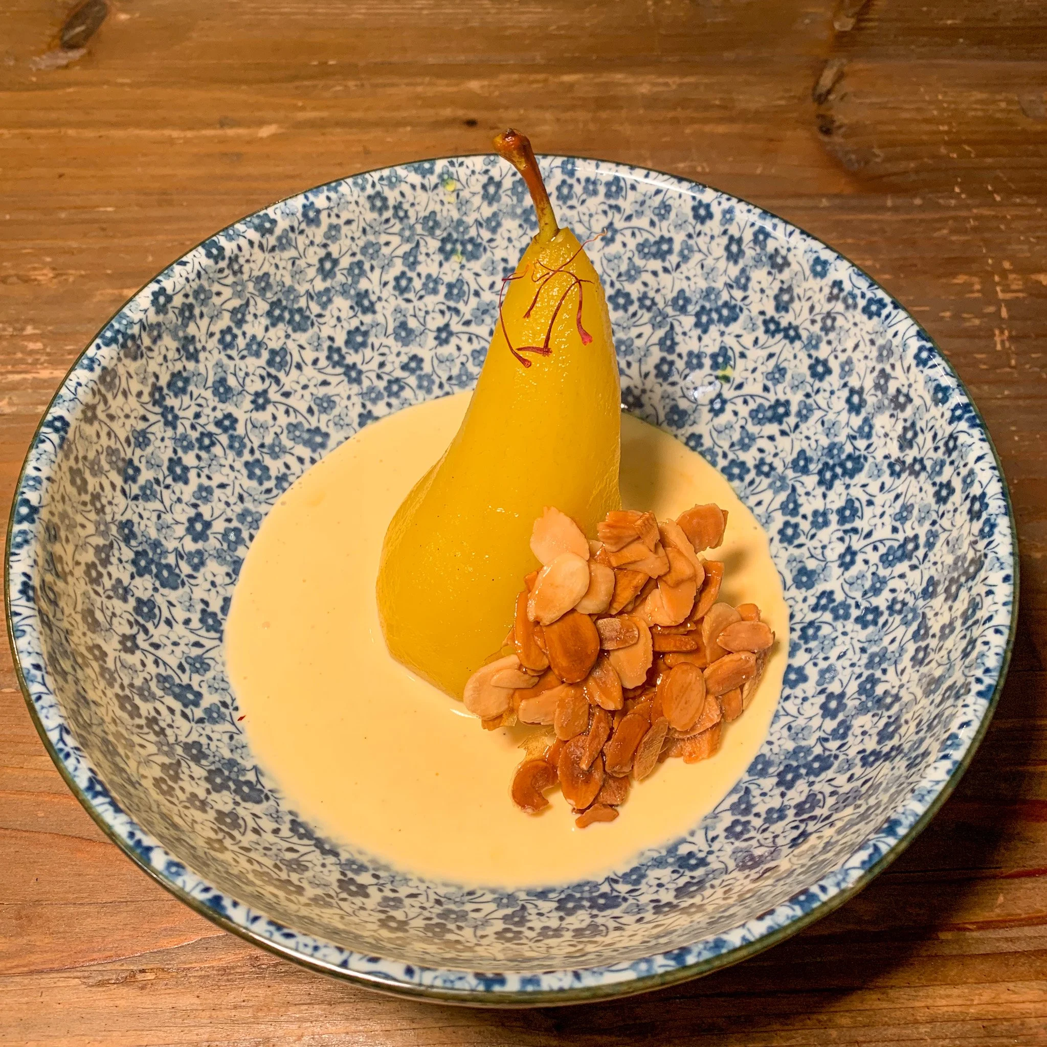 Poached Pear with Saffron, Cardamom served with Creme Anglaise and Crunchy Almonds