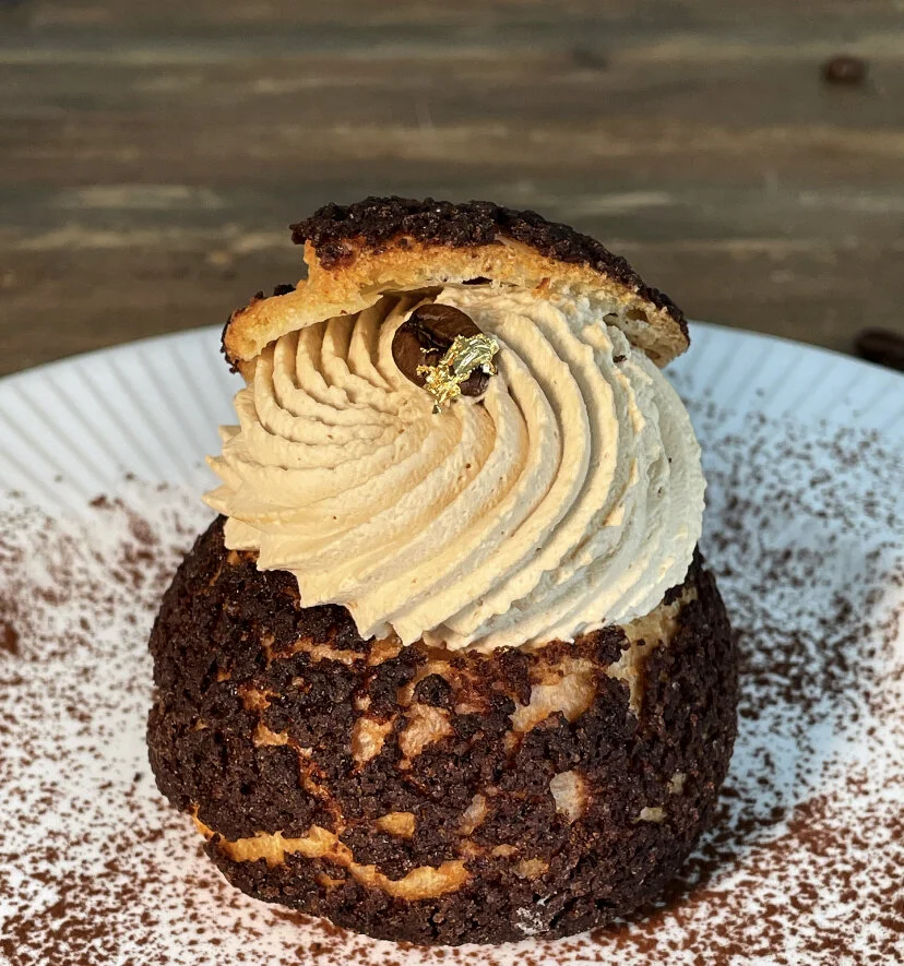 Add your Coffee whipped cream in a piping bag with your preferred nozzle (I used a french star tip) and pipe a nice swirl on top of your choux